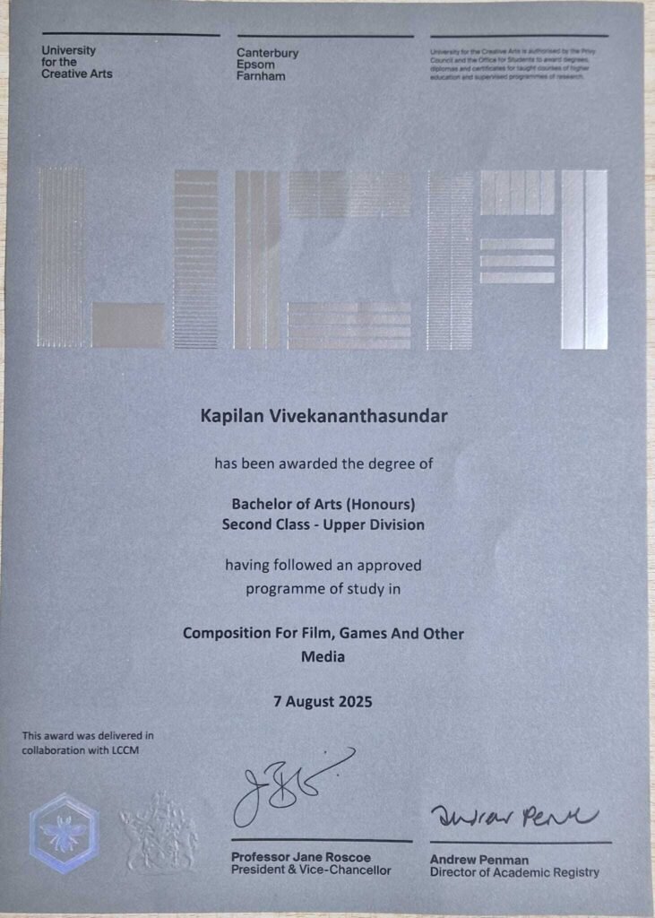 I am Kapilan Vivekananthasundar, a Film & Game Composer and music educator based in the UK. I hold a Master’s degree in Film & Game Composition and a BA (Hons) in Composition for Film, Games and Other Media, both awarded by the University for the Creative Arts and studied at LCCM (London College of Contemporary Music).